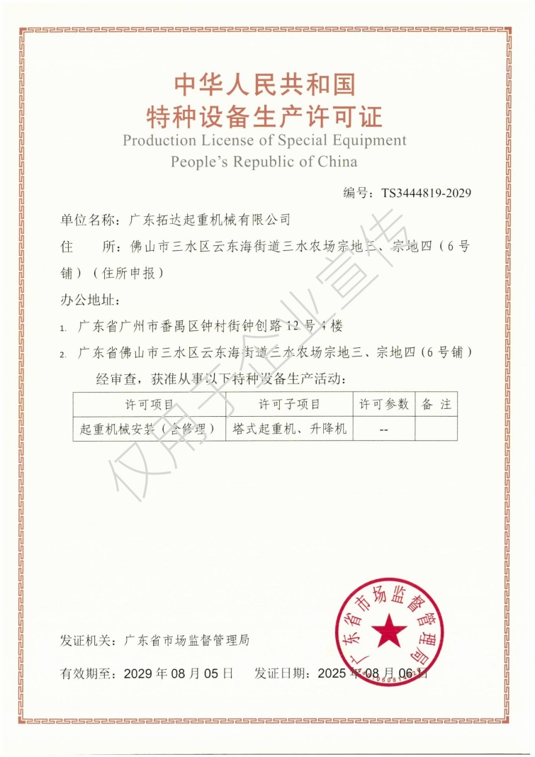 近日,广东拓达起重机械有限公司正式取得《中华人民共和国特种设备生产许可证》,成功获批两项资质:桥式、门式起重机制造(含安装、修理、改造)B级,规格为 200 吨及以下;塔式起重机、升降机的安装(含修理)。